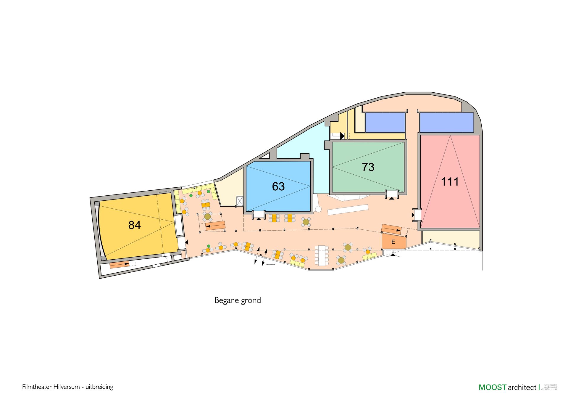 Een grote zaal van 82 zitplaatsen is 2 meter de grond in gezakt en daarbovenop is een kleine zaal van 40 zitplaatsen gedacht.